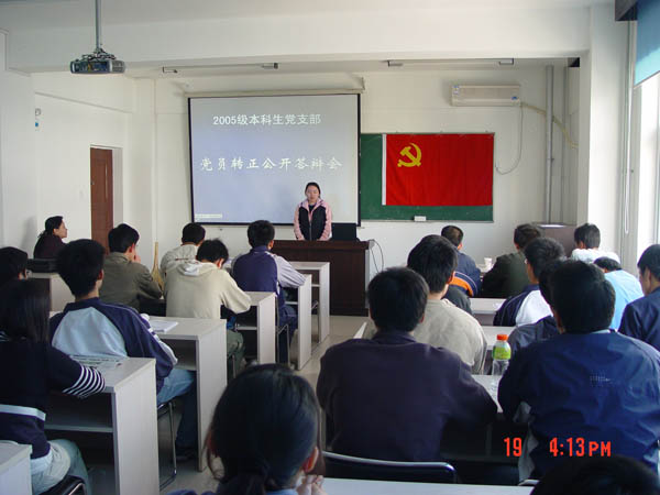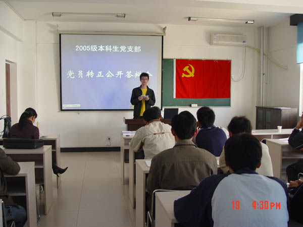 上学期以来,软件学院在学生党员、党支部中开展了党支部工作目标制、党员责任制、党员与党支部评估群众评议制,加大了群众对党员的监督力度,增强学生党员党性锻炼的自觉性。根据群众评议制的具体要求,2005年4月19日,软件学院2005级本科生党支部在后期楼423召开了学生党员转正公开答辩会。