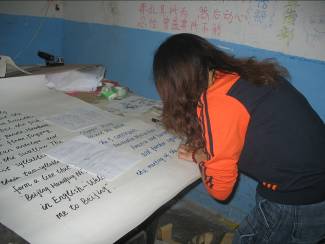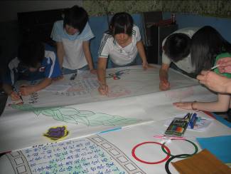 活动一确立下来,大家就明确分工,利用课余时间采购材料、工具;查找相关资料并做出筛选;设计板式处理图片,利用晚上的时间齐聚三号楼地下室开始我们的制作过程。虽然环境简陋,却丝毫不能分散工作时的注意力。大家一齐上阵,边写边画,好不热闹。