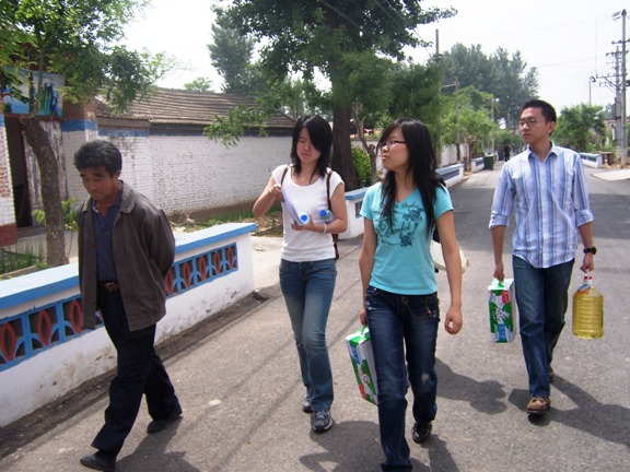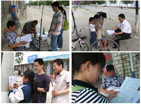 在“村官”周航同学的带领下,党支部成员首先参观齐家务村的新农村建设情况,党员们通过自身感受,深刻的理解了新农村建设的巨大成就和深远意义,党支部自费印制了有关奥运和抗震相关知识的简明手册,向村民们发放宣传,并做了有关奥运和抗震的问卷调查活动。