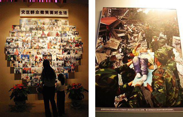 展览的第一部分“坚强领导,心系人民”,介绍了在灾害发生后党中央、国务院和中央军委紧急决策部署,中央领导同志亲临一线指挥,坚持人民生命高于一切的指导方针全面展开救援工作。第二部分“争分夺秒,全力营救”,介绍了部队、武警、公安紧急开赴地震灾区,火速解救被困群众,同时竭尽全力救治伤员,奋力抢修基础设施,保证人民生命和财产的安全。第三部分“临危不惧,奋起自救”展示了在救援同时,灾区党委政府紧急行动,尤其是基层党组织和共产党员发挥中流砥柱的作用,带领受灾地区各族群众顽强抗争。展览的第四部分“八方支援,共克时艰”记述了各地、各部门倾力支援灾区,社会各界向灾区送温暖、献爱心,港澳台同胞和海外华侨、华人情系灾区以及国际社会提供的有力支持和援助。第五部分“恢复生产,重建家园”向大家展示了灾区近况和规划,灾区群众正在坚持自力更生,在八方力量的帮助下,共同谱写美好未来。最后一部分“伟大精神,不竭动力”总结了抗震救灾中的伟大精神和英雄人物,他们彰显了伟大的民族精神,有以邱光华等为代表的时代英雄,也有以邹雯樱、林浩为代表的英雄少年。他们是中华民族崇高精神的代表,是祖国奋进的强大动力。在结束部分,“胜利属于英雄的中国人民”的浮雕是对此次抗震救灾最好的诠释。