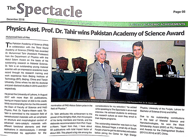 据the Spectacle报道,2018年12月,巴基斯坦科学院和发展中国家科学院授予我校材料学院2011级校友、巴基斯坦籍...