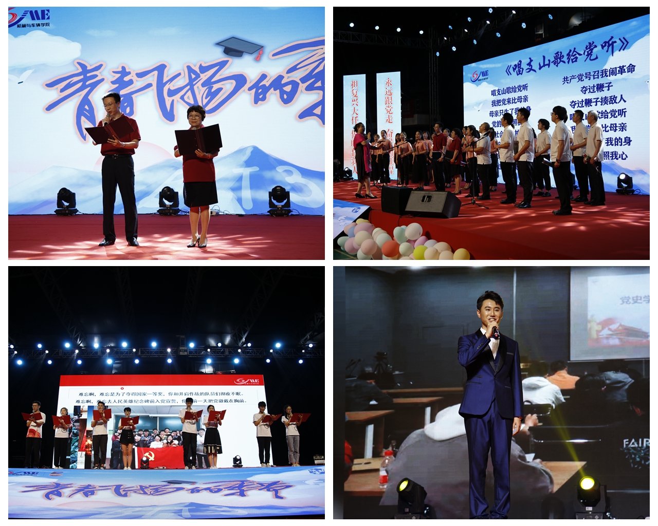 各支部党员代表共同带来的朗诵《青春的河》,在同志们饱含深情的诉说中缓缓淌过你我脚畔;初心不忘青春志,热血共筑中国梦,歌曲《不忘初心》表达了三院学子传承红色基因,永远跟党走的坚定信念;在冯慧华和薛庆的深情朗诵后,由机械学院教师组成的“魅力机车合唱团”,在校学生交响乐团合唱团艺术总监贺春华的指挥下,共同演唱《唱支山歌给党听》,用歌声传递了教师们对党的忠诚与热爱,和对伟大的中国共产党100周年华诞的真挚祝福;老师们又以一曲《再见》,将对学生们的送别娓娓道来,为即将远航的毕业生们送出最真诚的祝福。