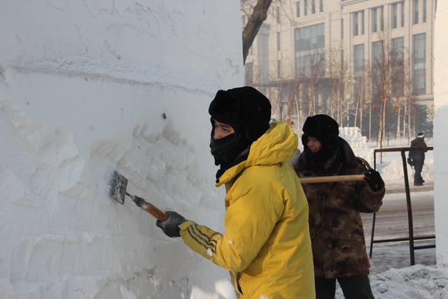 第三天,任务依然很繁重,比赛进入了白热化阶段,看着其他代表队的作品也逐渐成形,同学们的心里既紧张又激动。在雕刻过程中,周谷川队长看到女生坐在雪上进行雕刻时,毫不犹豫地就把自己的帽子摘了下来,让女生们坐在帽子上工作。遇到一些需要精雕细琢的部位,李雨璇和蒋亦希两位女生常常整个身体趴在冰上工作,整个雕刻过程她们始终保持着一丝不苟、精益求精的态度,丝毫没有叫冷叫苦。事后两个女生甚至自我调侃道:“我们都是女汉子中的‘女汉子’啊!”
