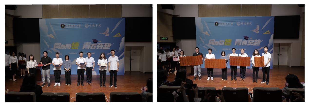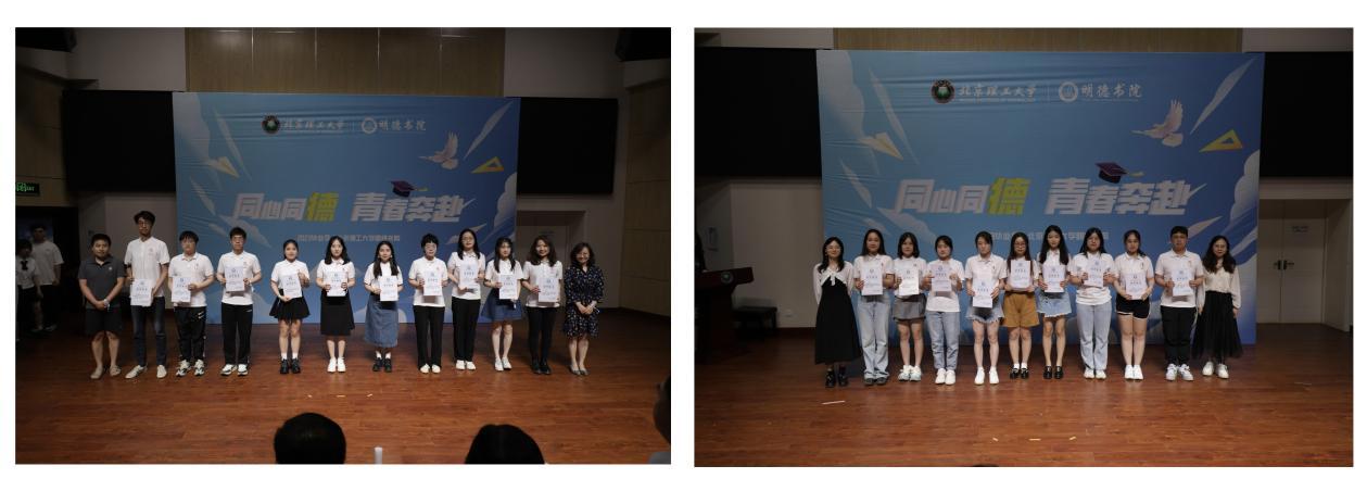 明德书院德昭班学育导师组长郑佳然、德正班学育导师组长薛少华、人文与社会科学学院学生工作办公室主任、团委书记颜笑、外国语学院学生办公室主任、团委书记马链、明德书院原朋辈导师、2018级学生代表李彦沨、冯靖涵等为明德书院优秀毕业书生颁发荣誉证书。