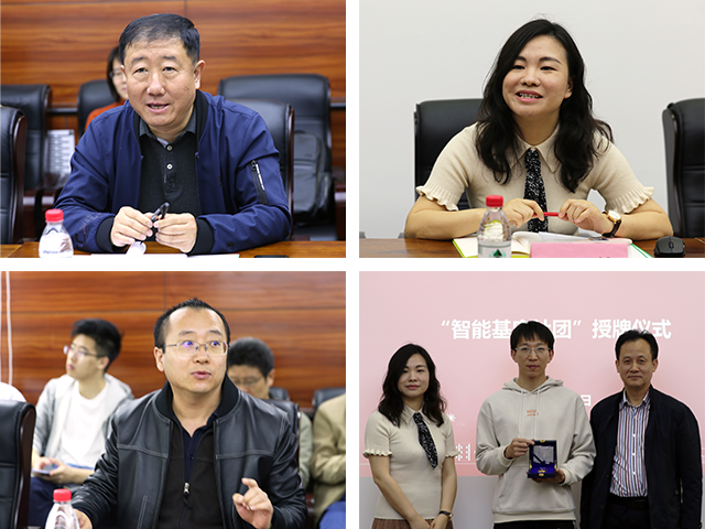 随后,进行了“智能基座社团”授牌仪式。王国仁与罗静共同将社团标志授予团长徐亚苗同学,标志着学生社团的正式组建成立。