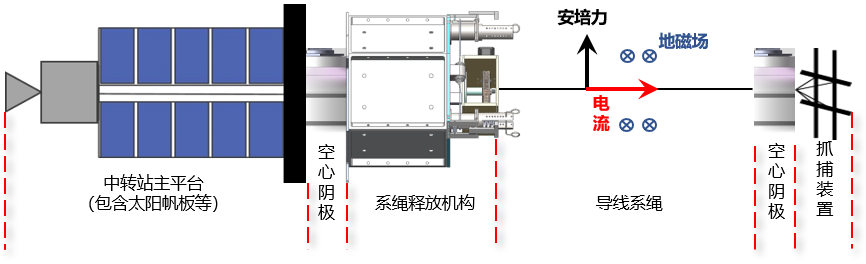 旋转绳系中转站平台组成及推力产生原理示意图