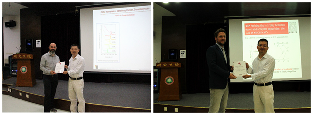 编辑:邵泽 审核:马壮 阅读次数:在国家外专局短期引智项目的支持下,受材料学院结构可控先进功能材料与绿色应用北京重点实验室主任张加涛教授、李红博教授邀请,国际半导体纳米晶/量子点研究专家米兰比科卡大学Sergio Brovelli教授和比利时根特大学Iwan Moreels 教授于9月22日至28日访问北理工。9月26日上午,在中关村校区研究生楼101报告厅分别作了题为“Colloidal synthesis of fluorescent 2D nanocrystals across the visible and near-infrared range”和“Advances in electronic doping of solution-grown semiconductor nanocrystals towards cutting-edge application”的“百家大讲堂”学术报告。张加涛教授代表北理工向两位教授颁发了北理工“百家大讲堂”纪念证书。材料学院钟海政教授、陈棋教授,上海交通大学李良教授,澳大利亚科庭大学夹国华教授,以及材料学院、化学学院其他青年教师和学生聆听了此次报告。