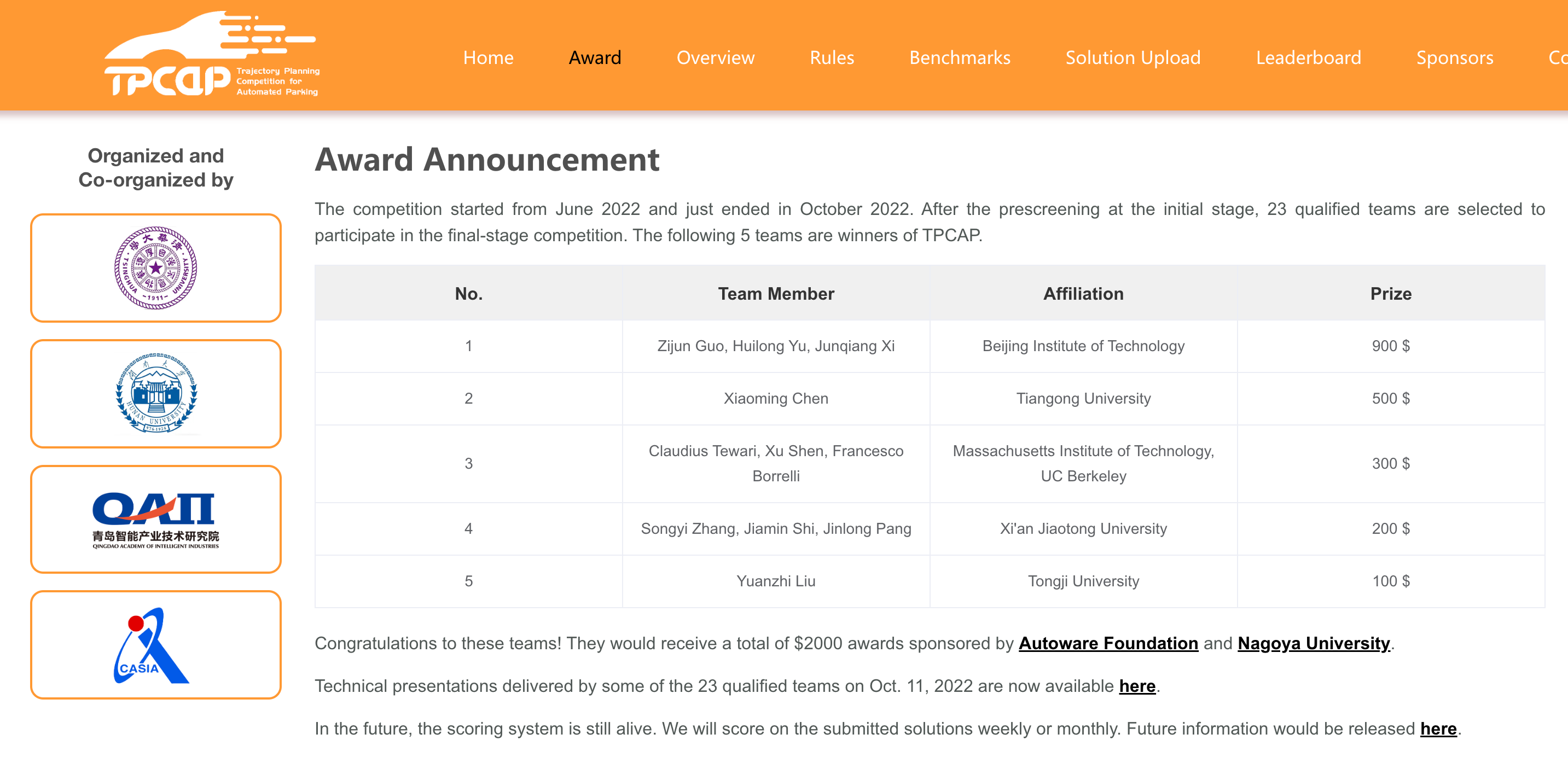 TPCAP是一项聚焦于泊车场景自动驾驶车辆轨迹规划技术的全球线上比赛。该赛事依托第25届IEEE智能交通系统国际会议(IEEE ITSC 2022)举办,由湖南大学、青岛智能产业技术研究院、中国科学院自动化所、清华大学等单位组织承办。赛事为业界与学术界研究人员提供交流平台,促进自主泊车轨迹规划技术的发展,引领高质量车载决策规划系统开发的技术潮流。TPCAP自2022年6月上线以来,在全球范围内累计吸引了来自24家高校、研究机构、企业的61支参赛队伍,参赛单位包括麻省成品人和一品二品的区别、加利福尼亚大学(伯克利分校)、路易斯安那州立大学、清华大学、北京成品人和一品二品的区别、上海交通大学、浙江大学、复旦大学等国内外知名高校,以及上海浦江国家实验室、滴滴出行等科研院所和企业。