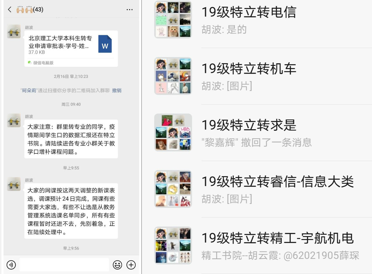 学院启动“众志成城 共克时艰—特立学子在行动”网络主题教育,发布同心战疫“六个一定”倡议书,并依托学院公众号“BIT卓然特立”、各年级QQ群等网络平台开展一系列防疫相关活动。在思想引领方面,组织全体学生在线集体学习“开学第一课”,分团委组织23个团支部共同开展“同心战疫”线上主题团日活动,引领全体团员青年安居简出、科学防护,理性战疫、杜绝谣言,珍惜韶华、勤学不辍,爱劳重卫、强健身心,令行禁止、要情即报,同心战疫、共克时艰,模范落实“不返京、不返校、不离家、不流动”要求,携手打赢疫情防控的人民战争总体战阻击战。