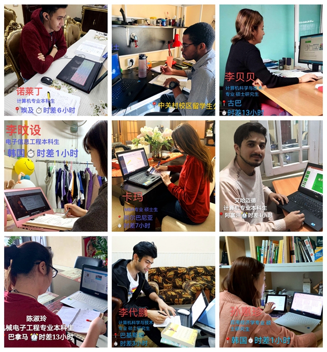 别样的风景,一样的精彩。从艳阳高照的东半球到夜色苍茫的西半球,从夏末炙热的南半球到即将迎来春暖花开的北半球,如期开课的春季学期犹如吹响的集结号,分布在五湖四海的北理国际学子纷纷行动起来,开启了不同寻常的新学期。在2月24日的教学首日巡查中,留在校内的孟加拉籍本科生陶天和身在武汉的乌干达籍本科生懿虹作为留学生代表同校领导进行了视频连线,详细汇报了自己的学习生活情况,表示一定要珍惜时光、勤奋学习。一周来,住在校内的同学早早打开电脑、备好书本,等待老师“上线”,或是在乐学平台上认真寻找着自己的专业课程,准备进行课前预习;住在校外和中国境内其他城市的同学则保持着健康良好的生活规律,在按时上线的同时不断完善自己的学习方案;身在海外的同学们积极面对新情况新挑战,及时调整学习状态,来自埃及的本科生诺来丁等同学在当地时间凌晨时分爬起、纷纷上线打卡,就为能与学校的线上教学同步;还有即将毕业的硕博生,匆匆吃过早饭后就迫不及待的与导师及同学们进行线上讨论……每一名北理国际学子都在努力适应疫情下新学期的学习和生活,把疫情对自己学业的影响降到最低。开课第一周,虽然隔着屏幕,但不论是留在校内宿舍、还是远在千里之外的国际学子们,依旧可以感受到北理老师们饱满的教学热情和精湛的授课技艺,大家同在“云端”上的知识海洋里尽情畅游。