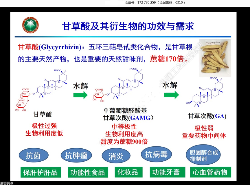 作为本次活动承办单位,北京成品人和一品二品的区别推荐路演的两个项目备受参会人员的广泛关注。来自化学与化工学院李春教授团队的吕波特别研究员分享了“甘草酸衍生物分子模拟筛选与制备项目”的相关情况。该项目通过分子设计和理论计算,给出基于甘草酸及其衍生物的候选小分子药物,可获得防疫新型冠状病毒侵染与减少炎症风暴的甘草酸结构衍生物。课题组具有多年研究积累,目前正在与某重点医药企业合作实施中试扩大,成果具有良好的转化应用前景。
