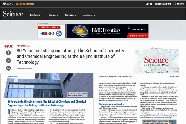 国际著名学术期刊《Science》报道北理工化学与化工学院发展建设
