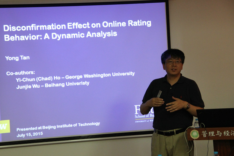 7月15日,第六场学术讲座在我校管理与经济学院举行。讲座由管理与经济学院协办,邀请了美国华盛顿大学福斯特商学院谭勇教授,为师生们作了题为“Disconfirmation Effect on Online Rating Behavior: A Dynamic Analysis”的学术报告,受到了老师和同学们的热烈欢迎。谭勇教授围绕网上商品评价这一热点问题展开,讲解了商品不确定性对消费者评价行为的影响等内容。谭勇教授的报告深入浅出,在座师生收获良多,并与谭教授就感兴趣的问题进行了热烈的讨论。